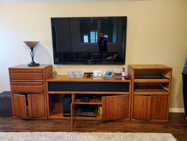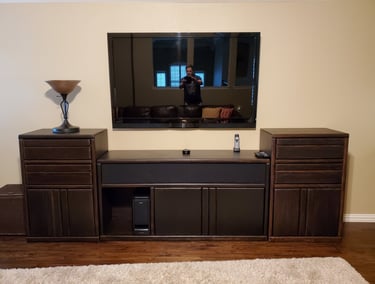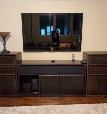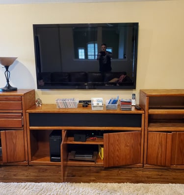 This customer had a custom entertainment center they wanted changed from a honey oak stain (left) to a dark walnut stain (right).