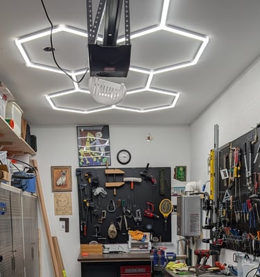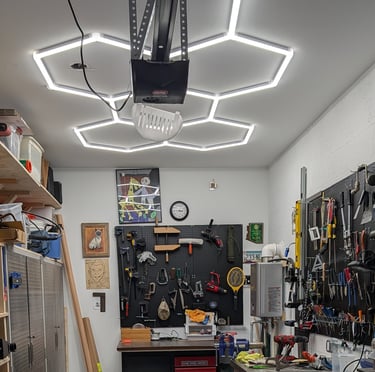 Hex lighting a modern, modular LED lighting system arranged in honeycomb-shaped grids, designed to provide high-intensity, shadow-free illumination for workshops, car detailing, home gyms and bright garages.