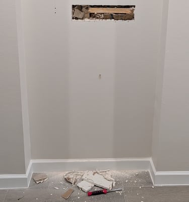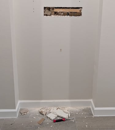 Here is a typical progression of a larger drywall fix (pic 1). New drywall is put in the hole and given a flat layer of drywall mud (pic 2). When it dries, we meticulously match the existing drywall texture pattern to ensure this fix is invisible when complete (pic 3).